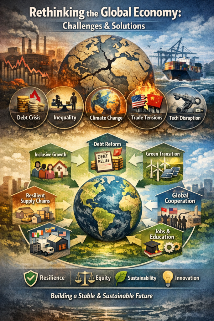 This article examines the major problems confronting the global economy today and explores practical, systemic solutions capable of delivering long-term resilience, equity, and sustainable growth.
